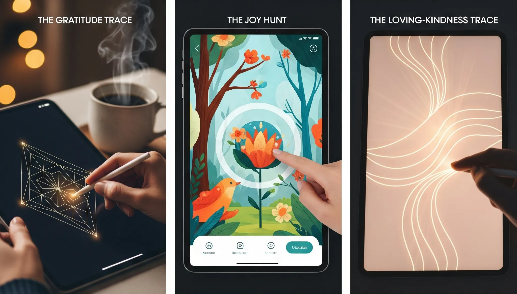 The beautiful thing about tracing meditation is that it's perfectly suited for this kind of emotional cultivation. When you're focused on the gentle movement of your stylus across the screen, following the curves of a mandala or the delicate lines of a nature scene, you're not just quieting your monkey mind—you're creating space for whatever emotions you choose to invite in.